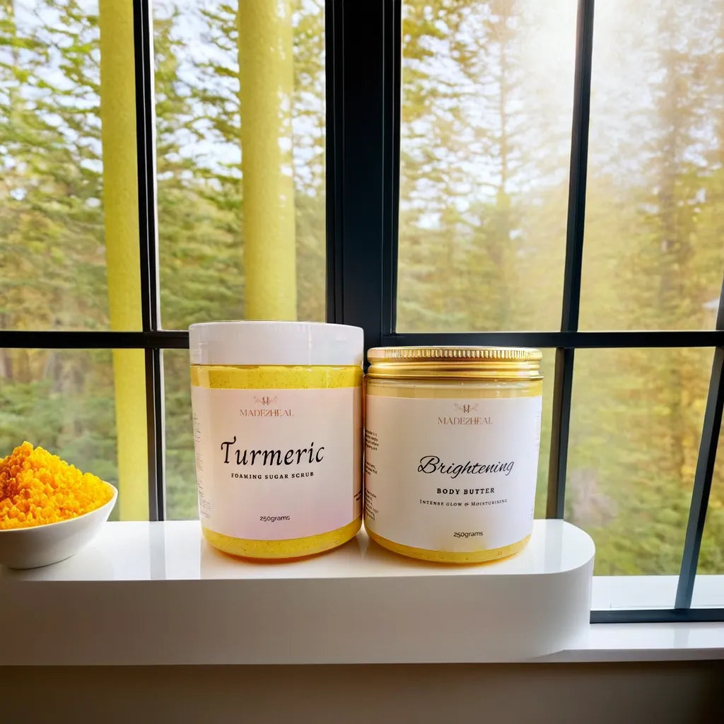 Elevate your skincare routine with the Glow Duo Bundle, featuring our Turmeric Scrub and Brightening Body Butter. The Turmeric Scrub gently exfoliates, revealing smoother, radiant skin, while its natural properties help even out skin tone.